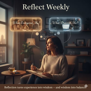 Amid the chaos of deadlines and demands, weekly self-reflection is your pause button — a moment to breathe, reset, and realign. Take ten quiet minutes each week to ask yourself two simple but powerful questions: What energized me? What drained me?